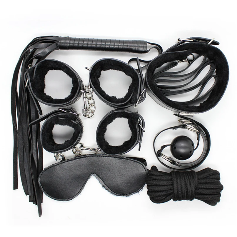 Goede Koop Sex Game PU Lederen 7 Bondage Kit Set Zachte Hand manchetten Zweep Touw Masker Bdsm Fetish Bondage Terughoudendheid Erotische Speelgoed voor paar Goedkoop