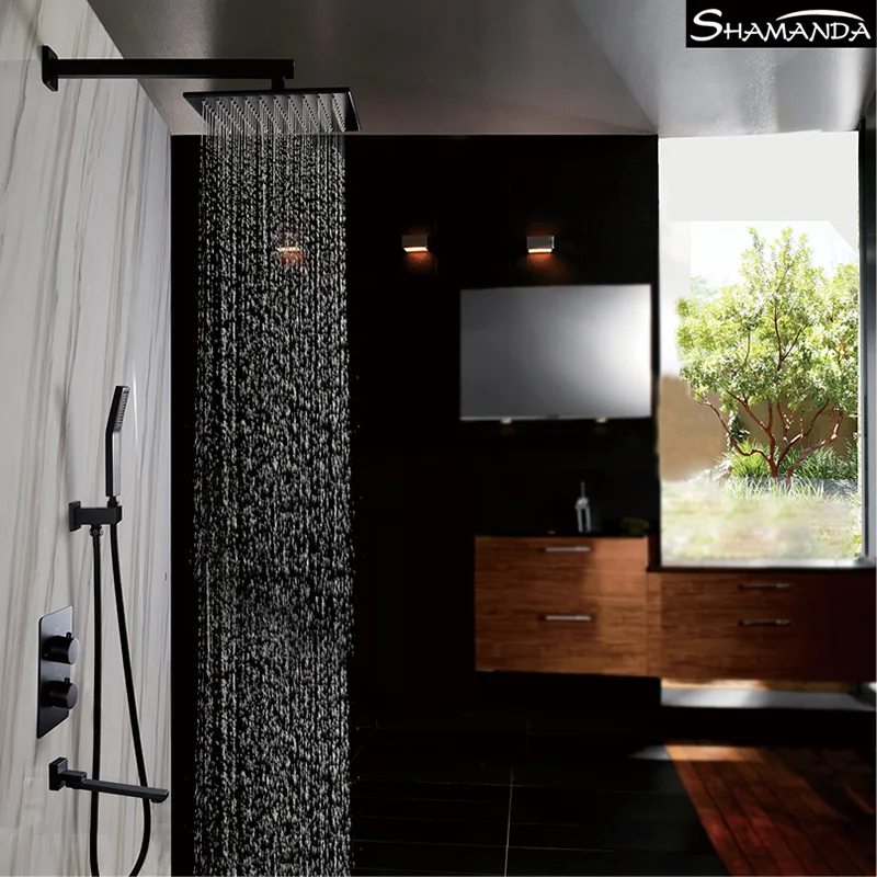 . Goede Kopen Massief Messing Wandmontage Zwarte Thermostatische Douche Set 3 Functies Ingebed Doos Handheld met 8 10 12 16 Inch Regendouche Goedkoop.