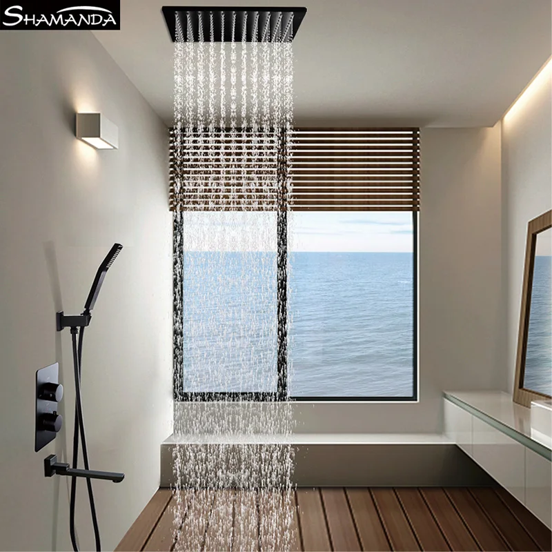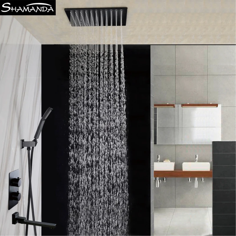 Beste Kopen Massief Messing Wandmontage Zwarte Thermostatische Douche Set 3 Functies Ingebed Doos Handheld met 8 10 12 16 Inch Regendouche Goedkoop.
