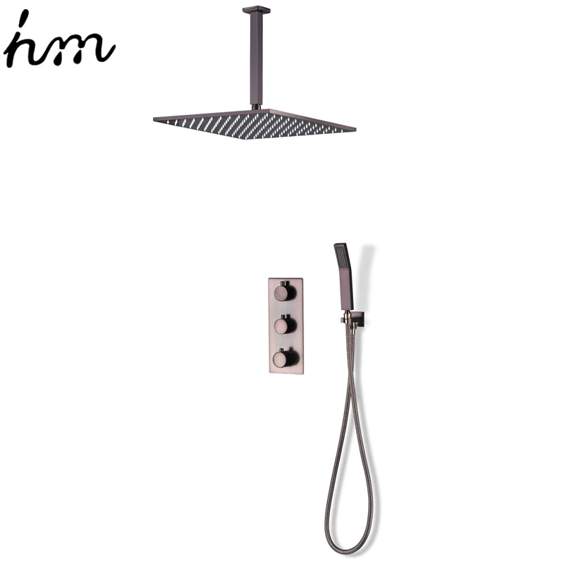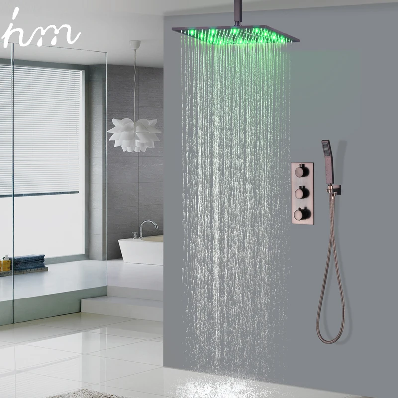 Goede Koop Hm Thermostatische Messing Badkamer Douche Zwart Kranen 16 \"Regendouche Douche Set Diverter Mengkraan orb LED Douche systeem Goedkoop