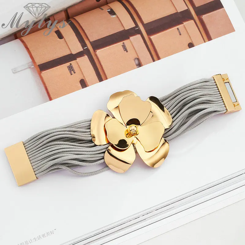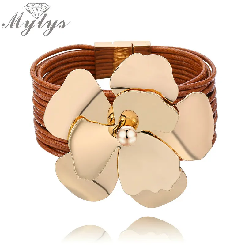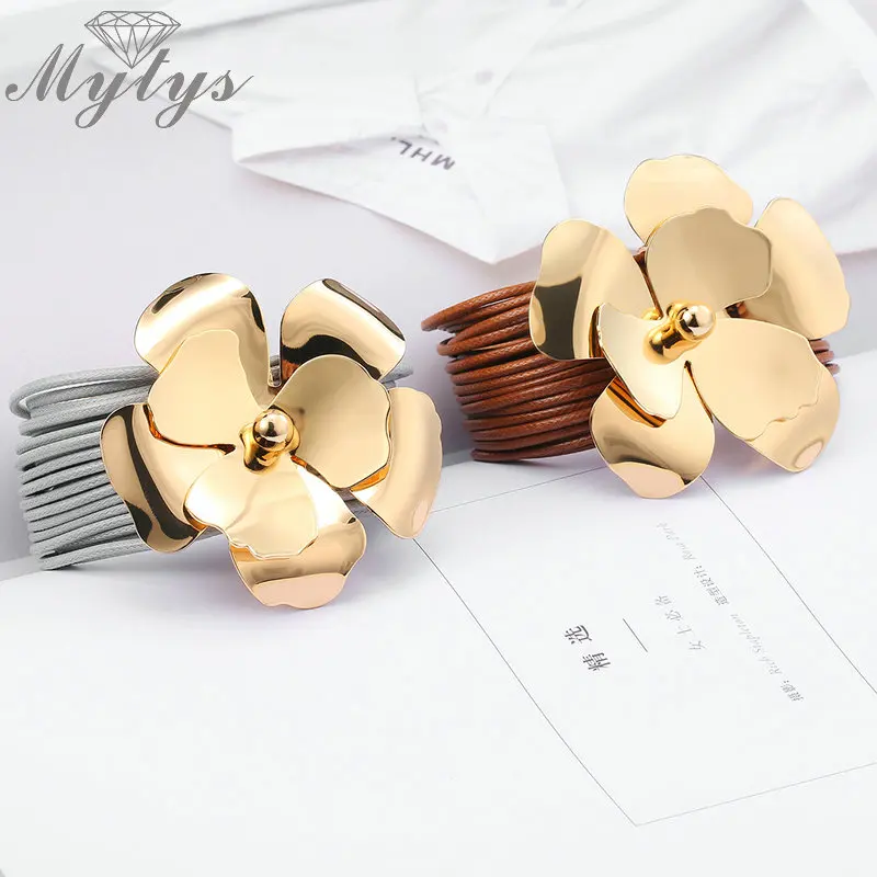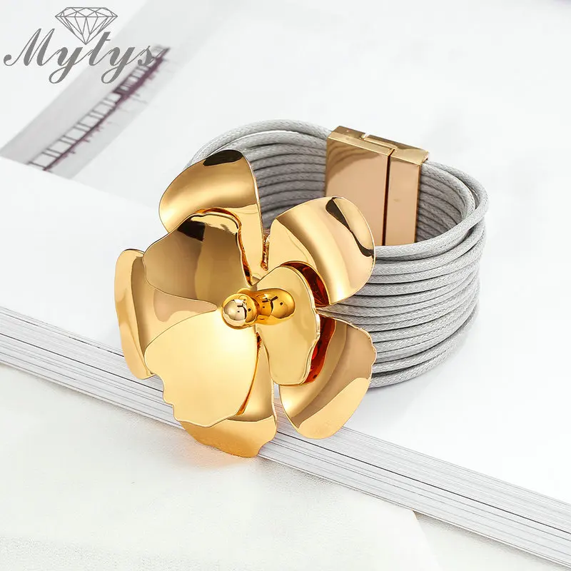 . Goede Koop Mytys Grote Metalen Bloem Multi Layer Touw Ketting Brede Armband Lederen Mode sieraden voor Vrouwen Magneet Sluiting Armband B1099 B1100 Goedkoop.