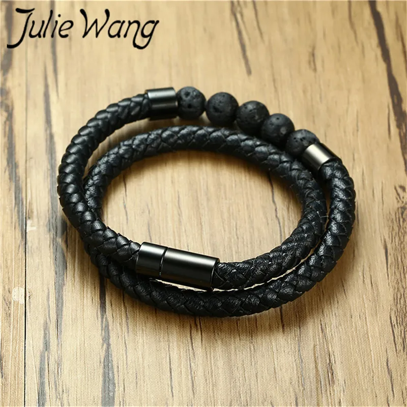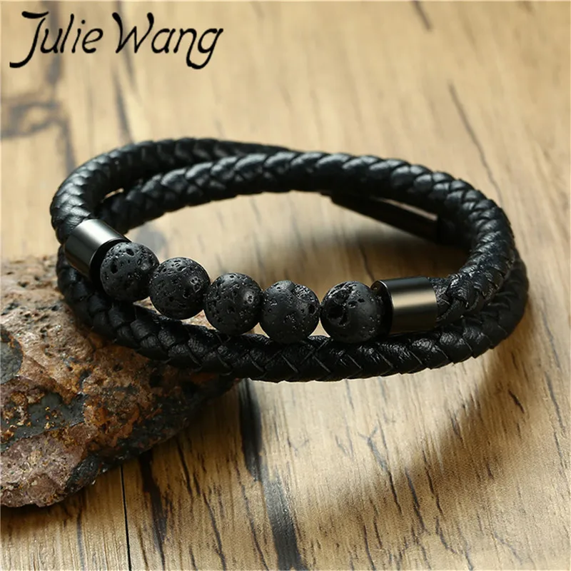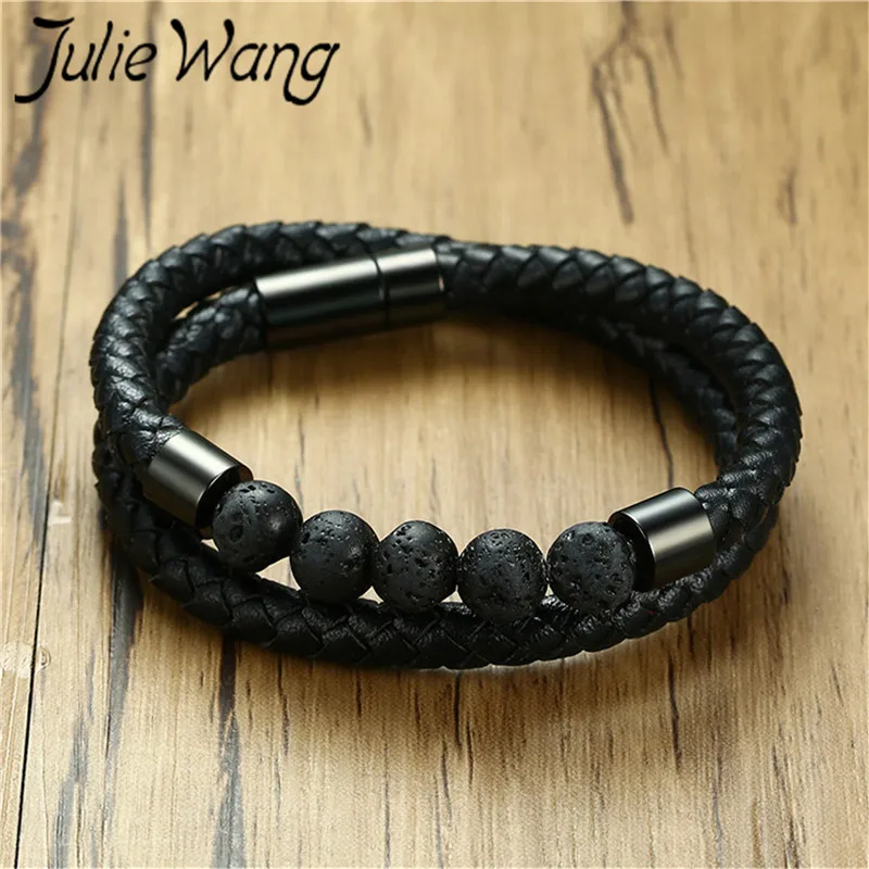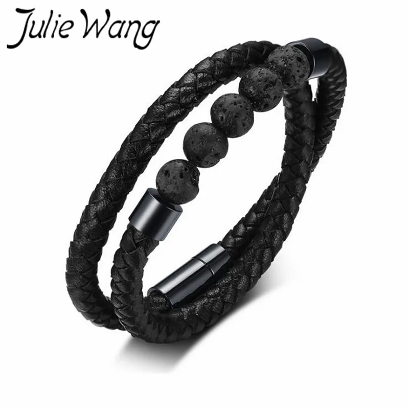 . Beste Koop JulieWang Rvs 44 cm Vulkanische Steen Microfiber Lederen Dubbele Cirkel Zwart Touw Natuurlijke Gezondheid Stijl mannen Beste Cadeau Goedkoop.