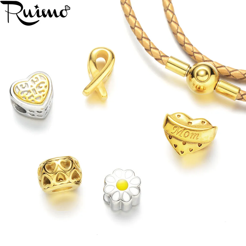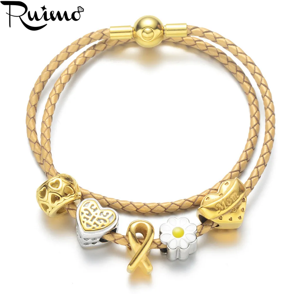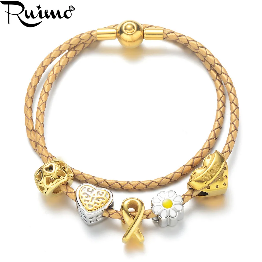 Beste Koop RUIMO Echt Leer Gevlochten Touw Vrouwen Armband Plating Gouden Kralen Armband Sieraden Hart Kralen Armband Voor Mama Liefde Geschenken Goedkoop.