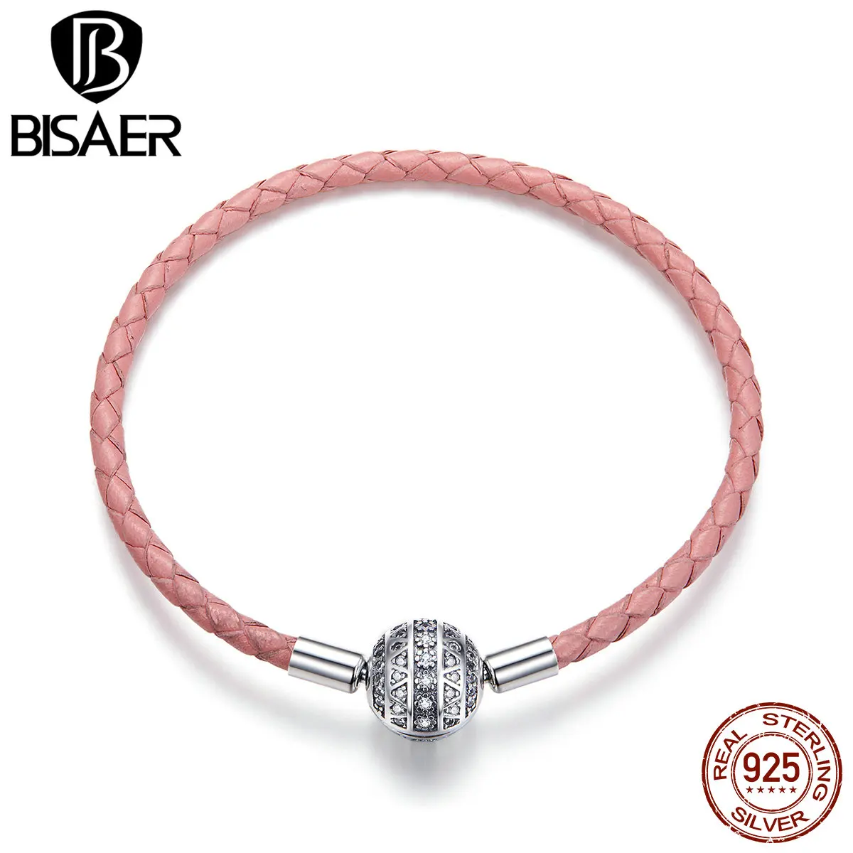 Goede Kopen BISAER Echt 925 Sterling Zilveren Roze Touw Lederen Armbanden voor Vrouwen Clear CZ Ronde Sluiting Touw Armbanden Zilveren Sieraden ECB114 Goedkoop.