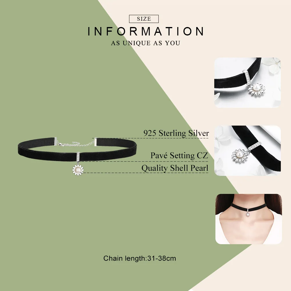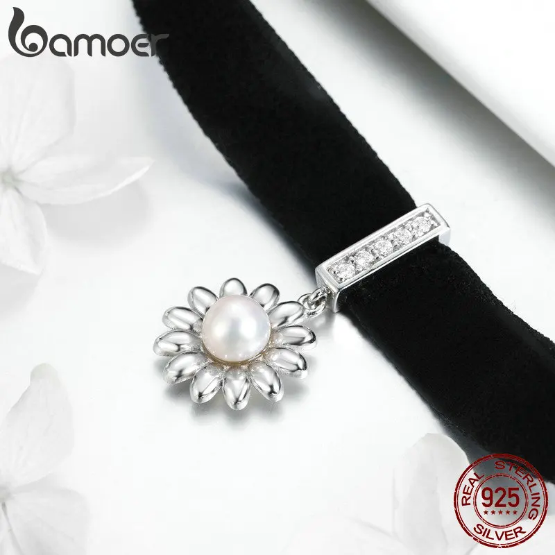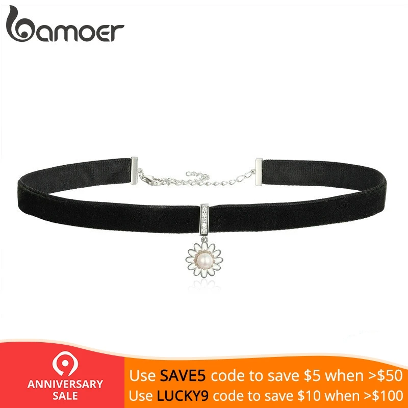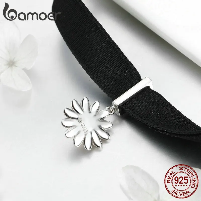 Beste Koop BAMOER Nieuwe Collectie 925 Sterling Zilver Daisy Flower Zwart Touw Strip Choker Kettingen voor Vrouwen Partij Sieraden Maken BSN009 Goedkoop.