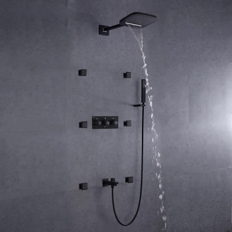 Beste Kopen DULABRAHE Waterval Badkamer Douche Mengkraan Set Wandmontage Regen Bad Douchekop Tap Zwart Zilver Goedkoop.
