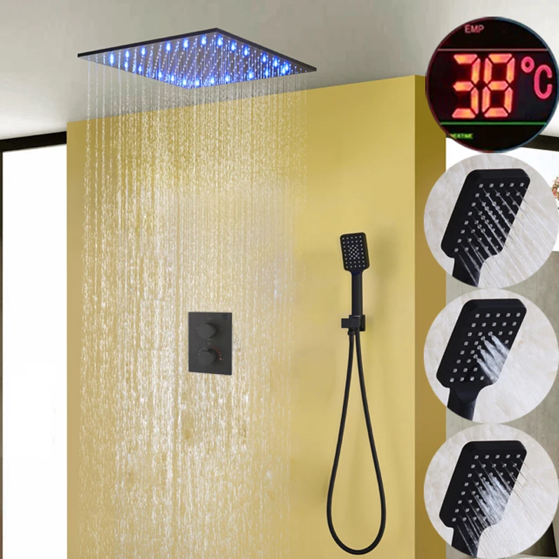 Beste Kopen Badkamer Rain Douchekraan Set Zwarte Bad Douche Panel Plafond LED Douchekop Thermostatische Bad Douche Mengkraan Goedkoop.